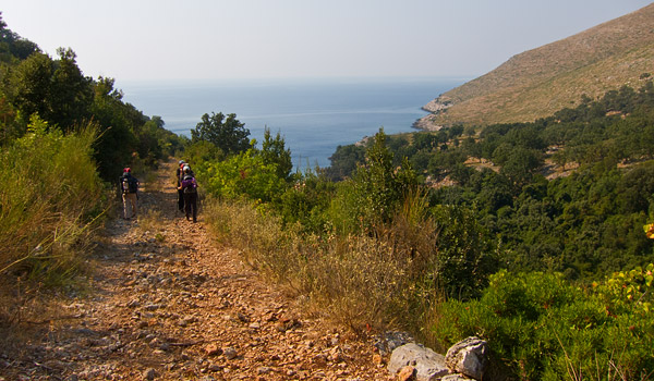 We set off for the trip early on Sunday morning. Thanks to the kindness of the local Albanian family who let us park in their backyard, we were able to leave our car close to the shepherd?s track at the foot of the mountains. It saved us about an hour of walking from our apartment in Orikum. We set off to go around the Pashaliman Lagoon in order to avoid the nearby naval base.